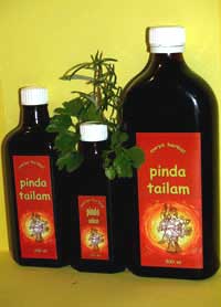Pinda tailam is recommended for a general massage. The water content in the oil is about 18 %. This ensures that the skin can breathe even when the oil is applied on the body for a long time. It is used for treatment of rheumatic and autoimmune diseases. The oil is best used warm.